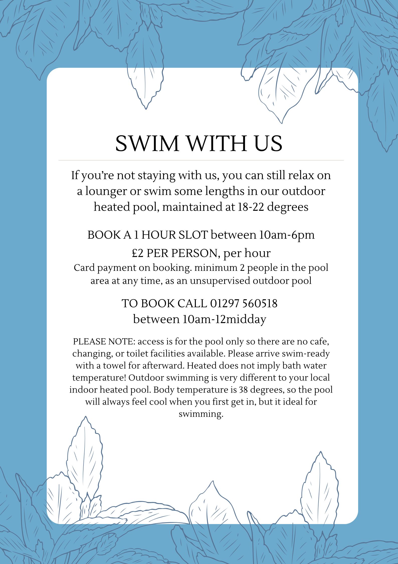 If you’re not staying with us but want to swim, whilst our building isn’t generally open to non-residents (so there would be no toilet/cafe or changing facilities) you can book to use our pool by arriving swim-ready and with a towel for afterwards.